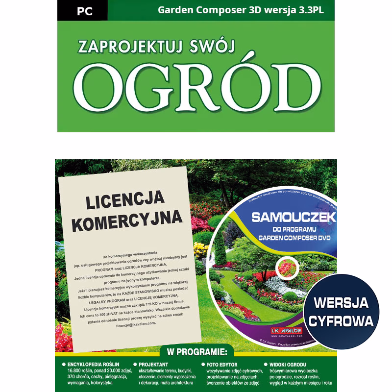 Najnowsza odsłona najpopularniejszego programu do projektowania ogrodów zawiera encyklopedię z opisem ponad 16800 roślin i 370 chorób oraz rozbudowaną cześć projektową. Program pozwala wczytywać i projektować bezpośrednio na zdjęciach, kształtować rzeźbę terenu, umieszczać w projektach budynki, małą architekturę, dekoracje. Automatycznie tworzy zestawienia roślin i kosztorysy. Wszystko całkowicie po polsku.